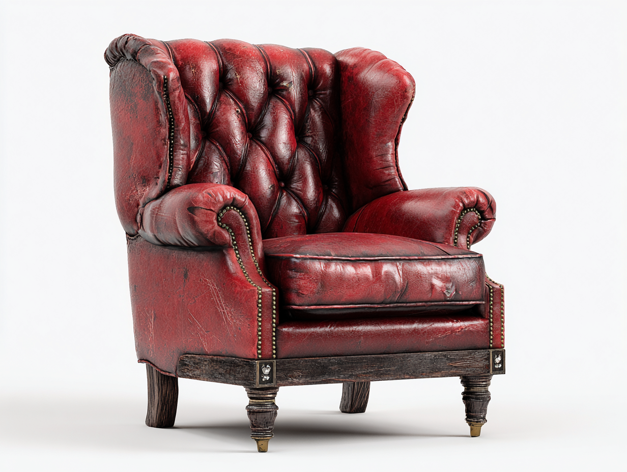 Der Sessel ist mit einem robusten Lederbezug in Rot ausgestattet, der eine leicht strukturierte Oberfläche aufweist. Die Polsterung ist gleichmäßig verarbeitet und wird durch eine stabile Holzkonstruktion im Inneren unterstützt. Sichtbare Ziernähte und Metallnieten unterstreichen den traditionellen Charakter.